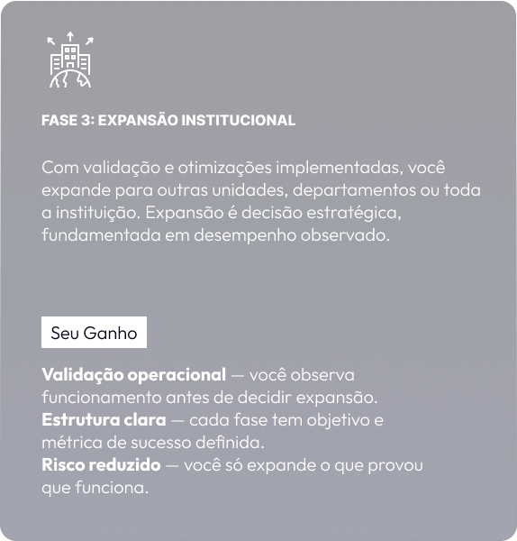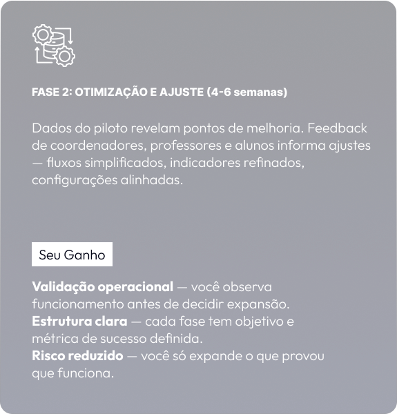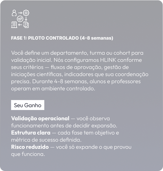 Nosso modelo minimiza risco operacional e garante alinhamento com sua realidade acadêmica.
